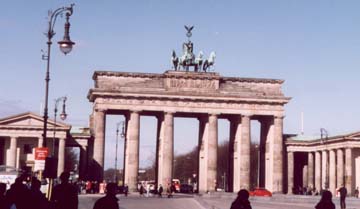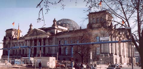 I spent 5 days sightseeing in Germany. There is quite a bit to see and I by no means saw very much. The first 4 days was spend on a DIS sponsored study tour I had signed up for. We left Copenhagen on a bus and travelled down to Berlin and was taken on a guided tour of the city and let to explore ourselves during the evening. Berlin was a very interesting city. Construction is quite common and looking over the skyline one sees more cranes than anything else, especially around the area where the Reichstag is located. One thing that surprised me, sice I hadn't really thought about it, was all the bullet holes left in many of the old buildings from WWII. Many churches, museums and government buildings that survived the war had spots where one could see it had been shot at and repaired. It brought quite a touch of realism to many of the history lessons I have had over the years. Below left is a picture I made from two pictures of the Reichstag, which is the main government building in Berlin. The inside was burned out by Hitler in his ascent to power in the 1930's. However it has been updated with a new modern interior. There is a glass elevator which leads up to the roof where one can walk up a spiral ramp inside of the large glass and steel dome which now sits on top of the building. From here one can see an excellent view of Berlin. As can be seen in the picture, there is much construction right in front of the Reichstag. the blue piping are water drain lines. Berlin is so low that when buildings are built, the water that comes up has to be continuously pumped out during construction. Below right is a picture of the Brandenberg Gate which separates the "east" from the "west". This picture was from the east side looking west.