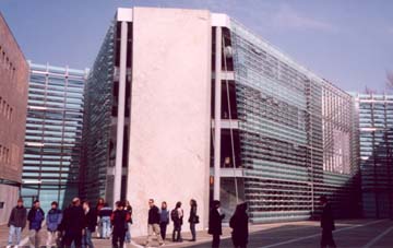 With Berlin once again becoming the Capitol of Germany many other changes are occuring. One is that all nations need to build new embassies in Berlin. The United States Embassy in Berlin is, at the moment, just an open plot of land. The Scandanavian countries were the first to build embassies. They decided to build them together in a complex surrounded by large copper rings. Pictured below is the Norwegian Embassy. The Stone in the front is carved from a single piece of granite that came from the side of a mountian in Norway. It is about 3 feet thick and quite tall as one can see. All the embassies here have quite interesting architecture that is different and unique for each Scandinavian country.