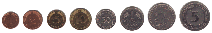 To finish off this page I have a picture of what the typical German coins look like. I tried to collect coins from every country I visited since this is one souviner that is genuine to each country. This should be all the German coins in use. One is of the front, the other the back.