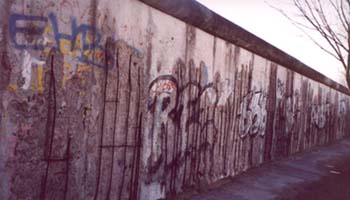 We also visited what little is left of the Wall. There are two small sections left of the wall that once divided this city. This is the better preserved section. Below left is a picture of what one saw on the west side of the wall. Below left is the end of this particualr section showing the cross section of it. It is not very high or thick as one might imagine or have seen on TV when it fell. The thickest and largest section was right around the Brandenberg Gate which was also a entry and departure place for people visiting the east.