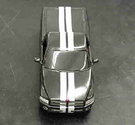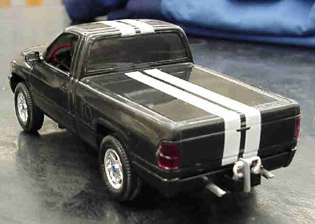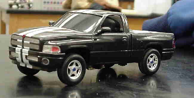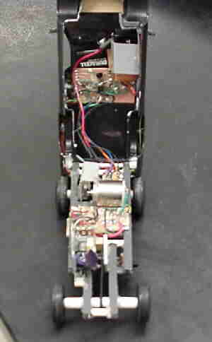 Our group decided to use a 1999 Dodge truck model as the base for our race vehicle. For the most part only the body of the truck and the wheels were used. A custom frame made of plastic I beams and round tube was constructed, with similar tubing used for the axles. A circuit for control of the truck was decided upon that would use and optical transistor to start the truck as well as to reverse the polarity on the motor once the six foot line was crossed. Initially a geared down potentiometer was going to be used to control a reverse circuit that would slowly back the truck up after the six foot line was crossed. However time constraints and difficulty with the potentiometer forced the potentiomer to be used as a set point for starting the truck. The reverse circuit was used as a brake in this instance however the initial swithching did allow for the truck to back up an inch or so. To drive the alignment potentiometer a 2:1 belt drive assembly was taken from an old tape player. Thi was coupled to a 16:1 worm gear assembly from a counter. Together this gave a 32:1 reduction, allowing for the potentiometer to only turn 4/5 of a turn in the 6 foot distance. To control the forward power distance a optical sensor made by Honeywell was used. They were basically light transistors, which consisted of an infared LED and an infared activated transistor, these two were spaced apart in a plastic housing and when the path was free, the sensor provided a signal that turned the motor on, when blocked no signal was present and the polarity of the motor was reversed. To accomplish this a small disk was attached to the potentiometer and it had a small vane that stuck out, this vane would travel around as the truck proceeded down the track, and when it crossed the six foot mark, it would cross the light path and stop the forward motion. The same type of sensor circuit was used to start the truck, with one of these sensors placed in the back where the liscense plate would be, a small plastic piece that hinged on the sensor was help away and the truck would be off, when it was swung down to turn the sensor off, it activated the forward circuit and the truck would begin its race. Two batteries were used. One to power the sensors and switching relays, and the second to power the truck. The body was hinged funny car style onto the frame, with multiple circuit boards attached where space was available to control various aspects of the truck. The first circuit board was the 5 volt power circuit which was located next to the motor above the rear axle. This circuit powered all the sensors and switching relays. The second board was the trasistor switching board. This board is where the signals from the optical sensors came into transistor arrays which turned on and off the switching relays. This board was located on the underside of the bed cover. The third board was located under the hood. This board housed the three relays used to switch the motor. The fourth board was the motor power board located on the frame in the middle of the vehicle. Originally this board had two voltage regulators which were to be set up to control the forward and reverse voltage of the truck. Problems in getting enough current to drive the motor caused us to wire the forward motion as direct from the battery, the reverse circuit was still run through a potentiometer but was not variable as originally intended. A gear box was also constructed out of plastic and various gears to multiply the torque from the motor so that the truck would start smoothly and quickly. Below are pictures of our race vehicle. You should be able to see the control potentiometer which needed to be carefully set so that the motor would reverse just before 6 feet.